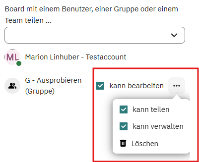 Wenn das Deck mit einer (oder auch mehreren) Gruppen geteilt wurde, muss noch das Recht zum bearbeiten erteilt werden. Du kannst aber auch gezielt ein Board nur zur Information, ohne die Möglichkeit zu Bearbeiten teilen. Über das 3-Punkte Menü (das man nur auf großen Bildschirmen sieht! Waagrecht scrollen oder Ansicht verkleinern) kannst du die Berechtigungen verfeinern oder eine Berechtigung wieder löschen.